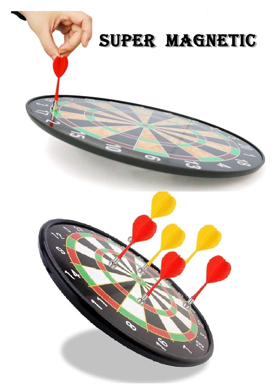 - -The safer way to play this dartboard uses a powerful magnet to hold darts in place, eliminating the dangers associated with sharp points