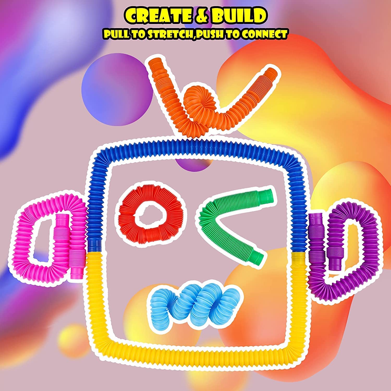 - The colorful bulky pack of stretch tubes are designed to help those who struggle with sensory processing difficulties and fine moto skills. The expandable pipe is stretched or compressed with a popping sound and you can connect the stretched tubes to create more fun. Get creative by twisting, joining and bending the tubes into colorful shapes and letters. It also helps improve bilateral coordination for kids and reduce stress for both kids and adults