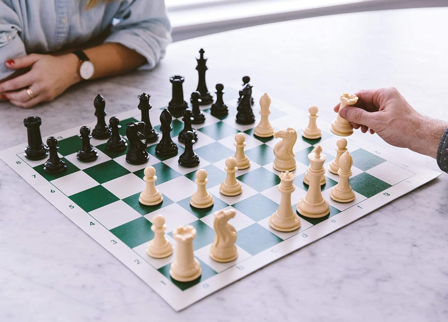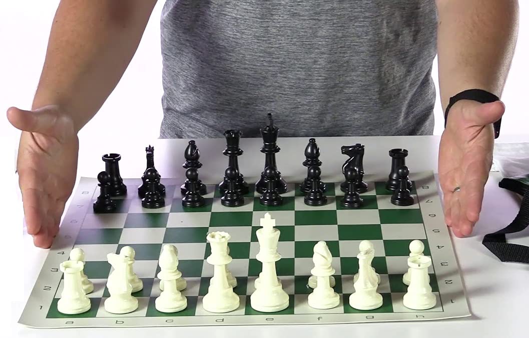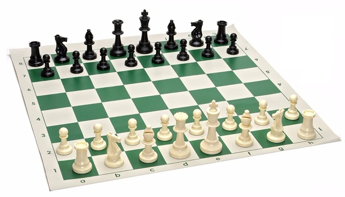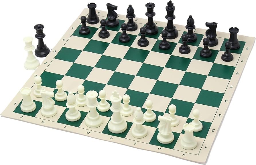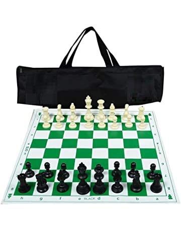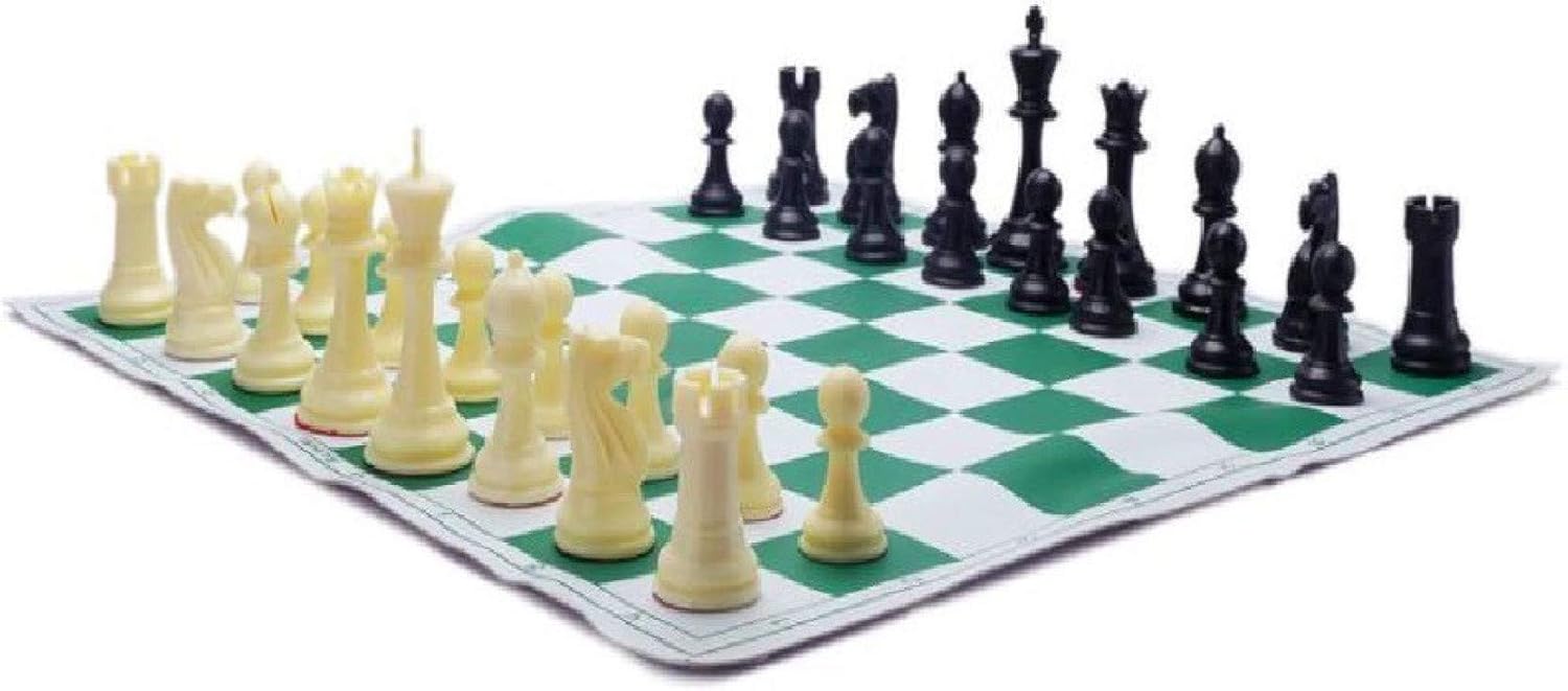 Chess each set includes 32 plastic hollow inside but Solid Enough, Staunton style chess pieces with a 3.55 inch King. Every piece is finest Moulded, Included a flexible Green/White vinyl chess mat that is easy to wipe clean and has rounded edges. Comes with a carry bag. This set meets the required height weight and proportions for home/tournament play. Our roll up board is equipped with algebraic notation on the perimeter for game analysis. Best for beginner and experienced players.