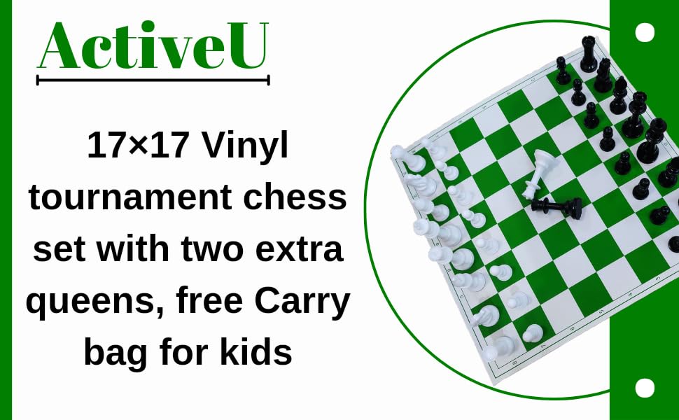 Tournament Chess Set 17″x 17″ Solid Chess Pieces and Green Mat Roll-Up Vinyl Chess Mat, Plastic Filled Pieces with 2 Extra Queens & Carry Bag